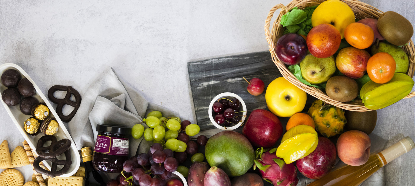 Elevate any gathering with our gourmet cheese platter, featuring an assortment of cheeses, crackers, and a fresh fruit selection including strawberries and grapes.