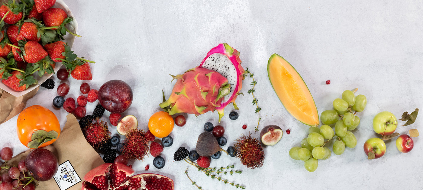 An assortment of fine fancy cookies arranged on a platter and accented with strawberries and grapes. A delicious dessert to be shared with all.