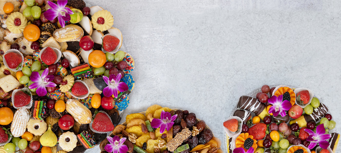 A variety of dipped fruits in the finest dark chocolate drizzled with white chocolate. To top off this delectable treat is an accent of strawberries, pineapples, and mini bananas.