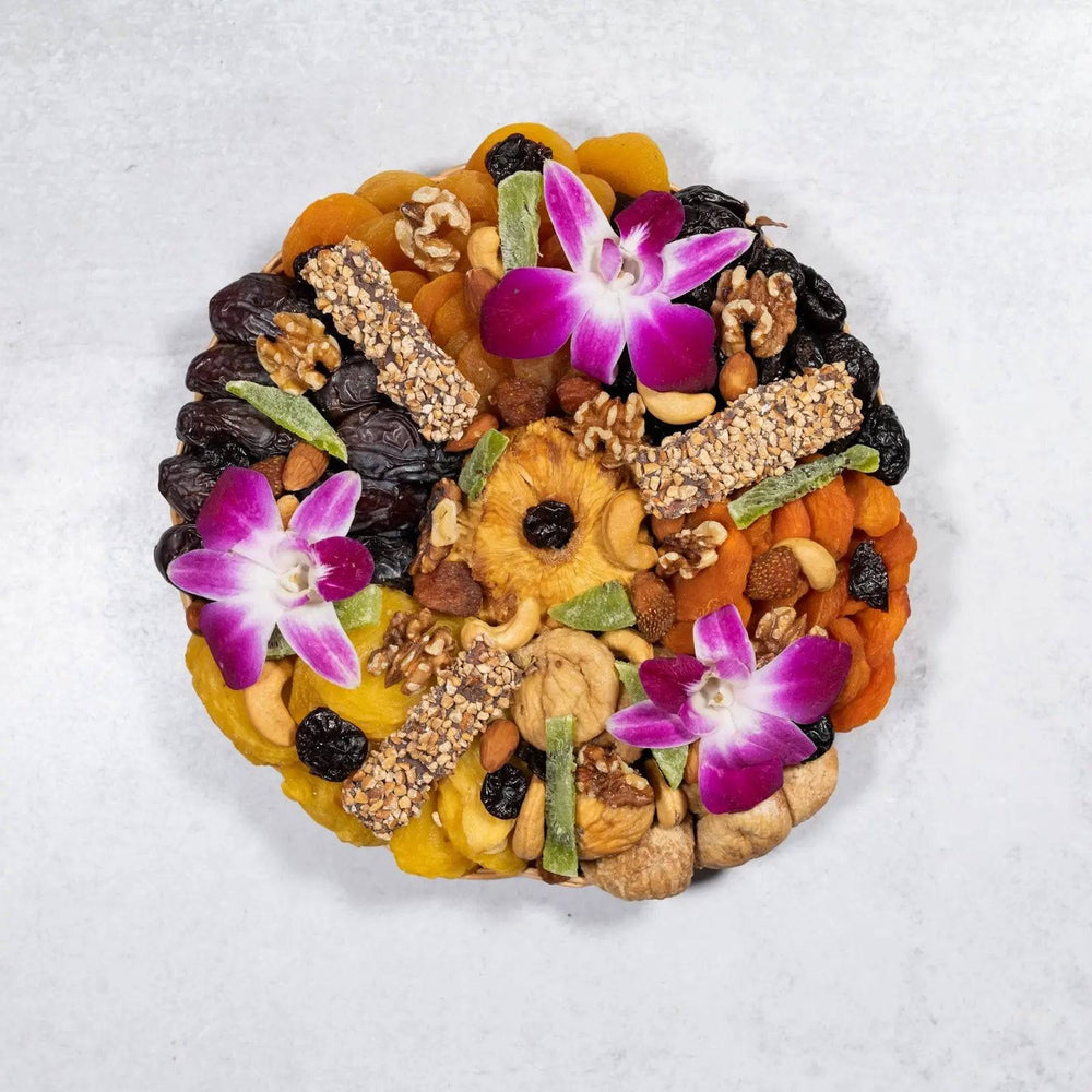 A traditional treat at holiday time our delicious dried fruit is also great for that weekend gathering. This elegant array of dried fruit has everything from apricots to dates and is crowned with crisp cashews and almonds all presented in a lovely wicker tray.
