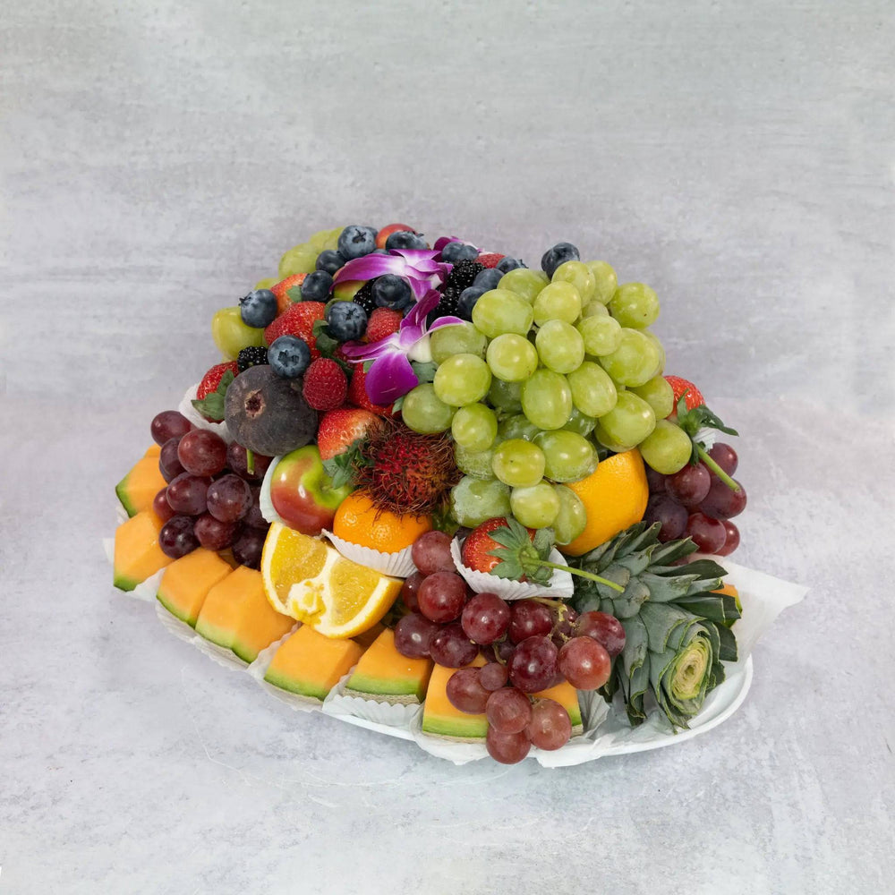 At the heart of this stunning arrangement lies a luscious vine-ripened pineapple, surrounded by crunchy grapes, sumptuous melons, and the finest over-sized strawberries from around the globe. Each piece of fruit is meticulously selected and delicately cut, delivering the sweet, refreshing sensation that will delight your guests. Make every event memorable with this exquisite fruit platter, designed for taste and presentation. Fruits may vary due to seasons and availability.