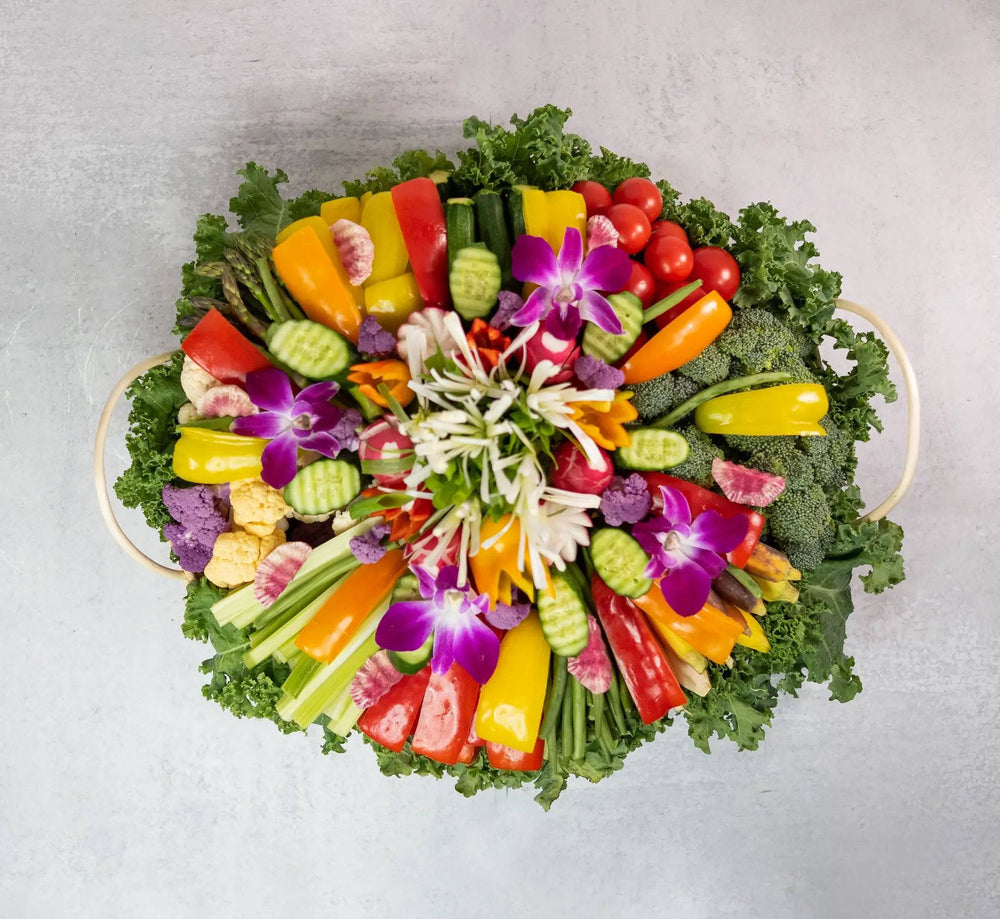 Everyone will love the fresh taste and healthfulness of our beautifully arranged vegetable platter. This colorful assortment of mini and assorted vegetables, presented in an elegant wicker basket, is truly a feast for the eyes and palate. Perfect for any event, this vegetable platter offers a delightful way to enjoy the natural goodness of raw vegetables.