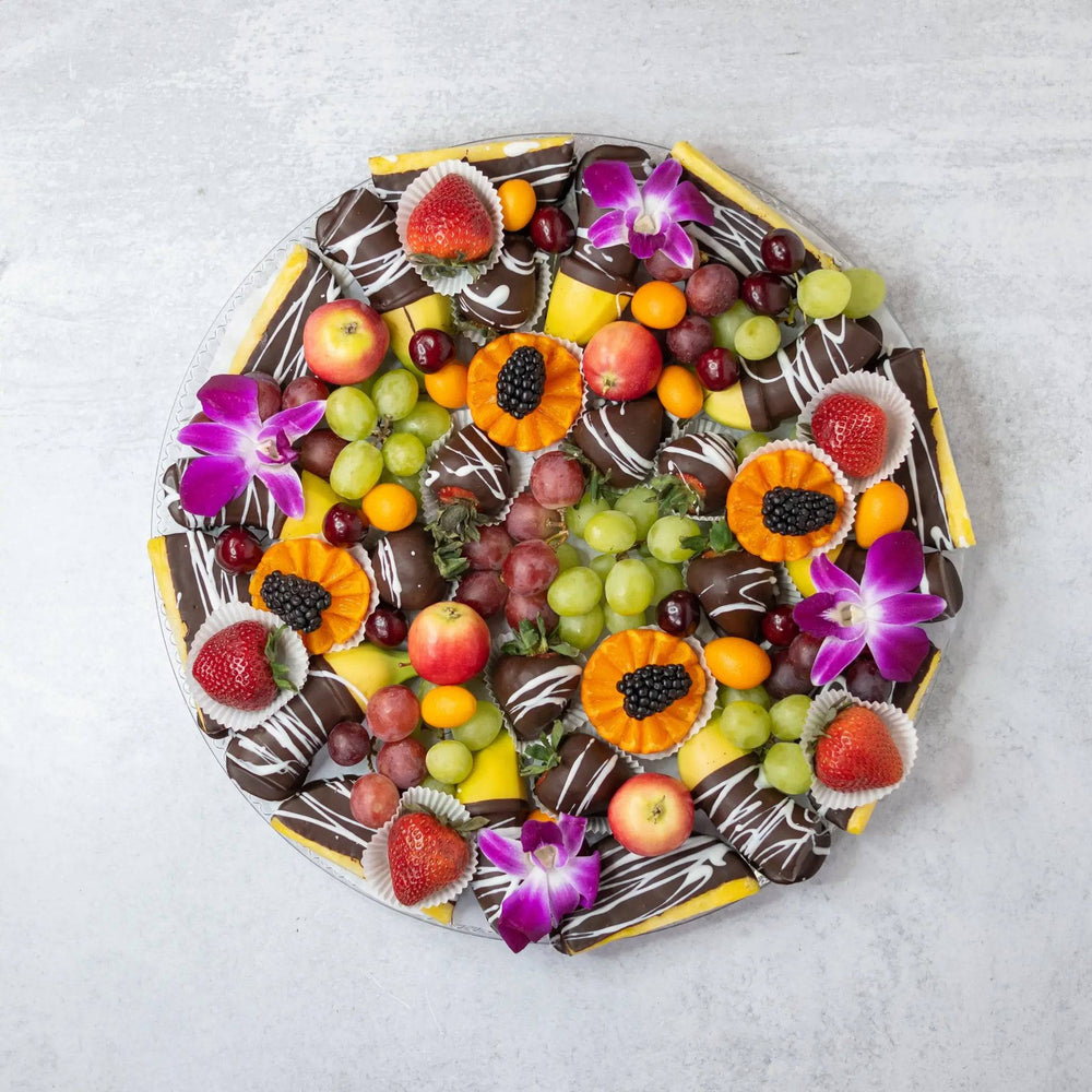 A variety of dipped fruits in the finest dark chocolate drizzled with white chocolate. To top off this delectable treat is an accent of strawberries, pineapples, and mini bananas. Chocolate lovers delight! 24 pieces.